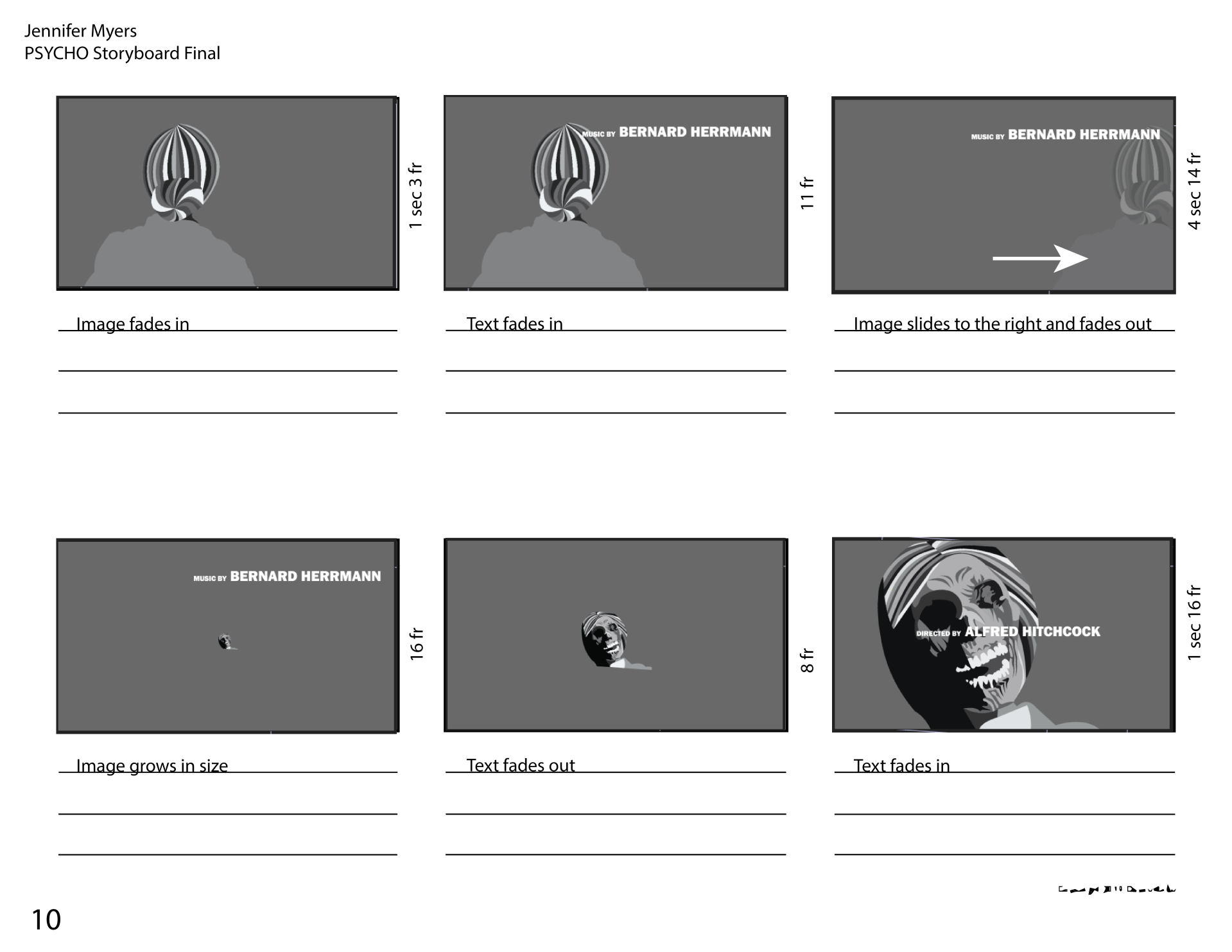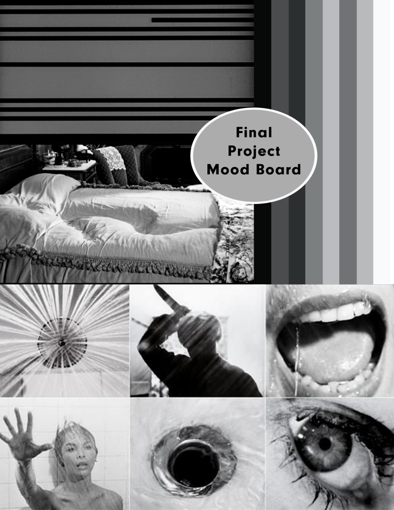 The redesign of Alfred Hitchcock's horror classic Psycho opening credits. Using a mood board to get a general idea of the redesign, I illustrated key moments from the film into vectorized imagery. I organized the layout of the opening credits through the use of a storyboard. Once organized, I manipulated the images into the opening sequence.
